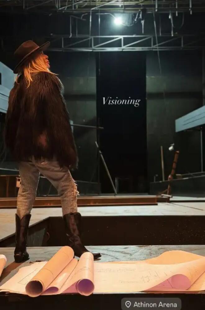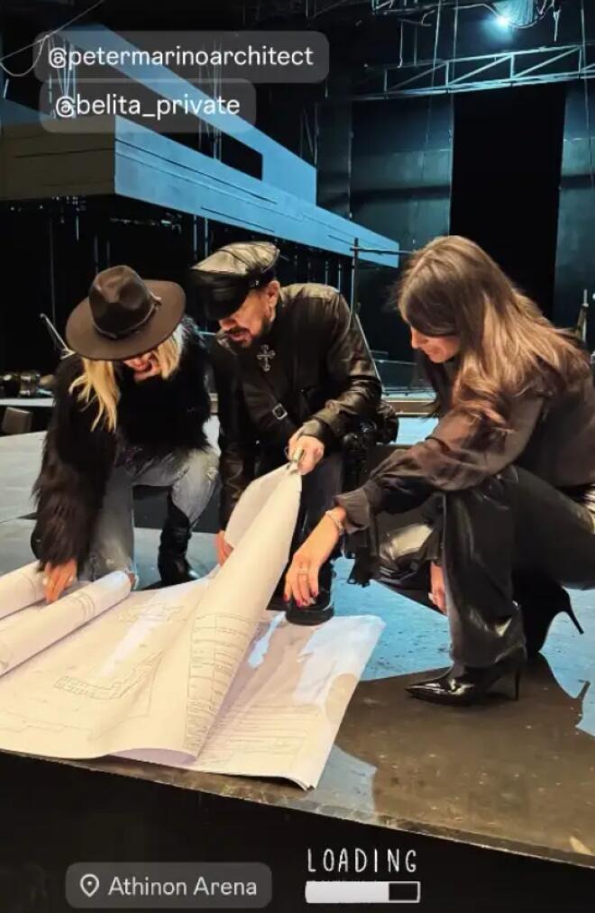 Πρόσφατα, η Ελληνίδα σταρ μοιράστηκε στιγμιότυπα από την Αθηνών Αρένα. Σε ένα από αυτά εμφανιζόταν μόνη της πάνω στη σκηνή, με τη λέξη Visioning να συνοδεύει την εικόνα. Σε άλλο καρέ, στεκόταν μαζί με τη στενή της φίλη και κουμπάρα Δήμητρα Κούστα και τον διεθνώς αναγνωρισμένο αρχιτέκτονα Peter Marino, κοιτώντας σχέδια και συζητώντας λεπτομέρειες.