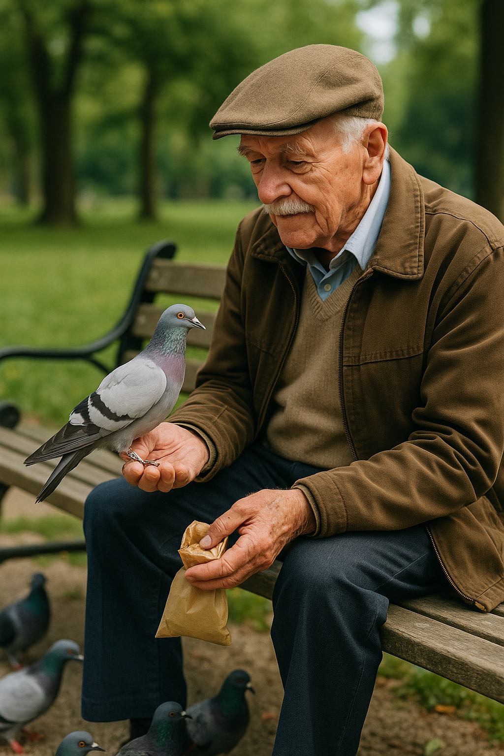 Στα χέρια του – μια χάρτινη σακούλα με σιτάρι, στα μάτια του – κούραση και καλοσύνη. Τα περιστέρια τον ήξεραν: μόλις εμφανιζόταν, δεκάδες φτερά υψώνονταν στον αέρα.