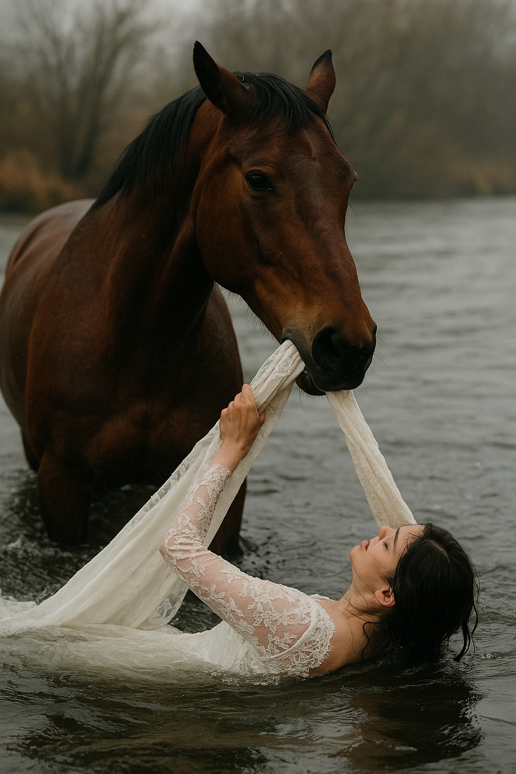 Στη μέση του ποταμού, στο θολό νερό, φαινόταν ένα λευκό φόρεμα. Ένα πραγματικό νυφικό — μακρύ, βαρύ, με δαντέλα. Και δίπλα του — ένα άλογο. Μεγάλο, καστανό, με βρεγμένη χαίτη, που φαινόταν σαν να είχε βγει από την πραγματικότητα, σαν από όνειρο.