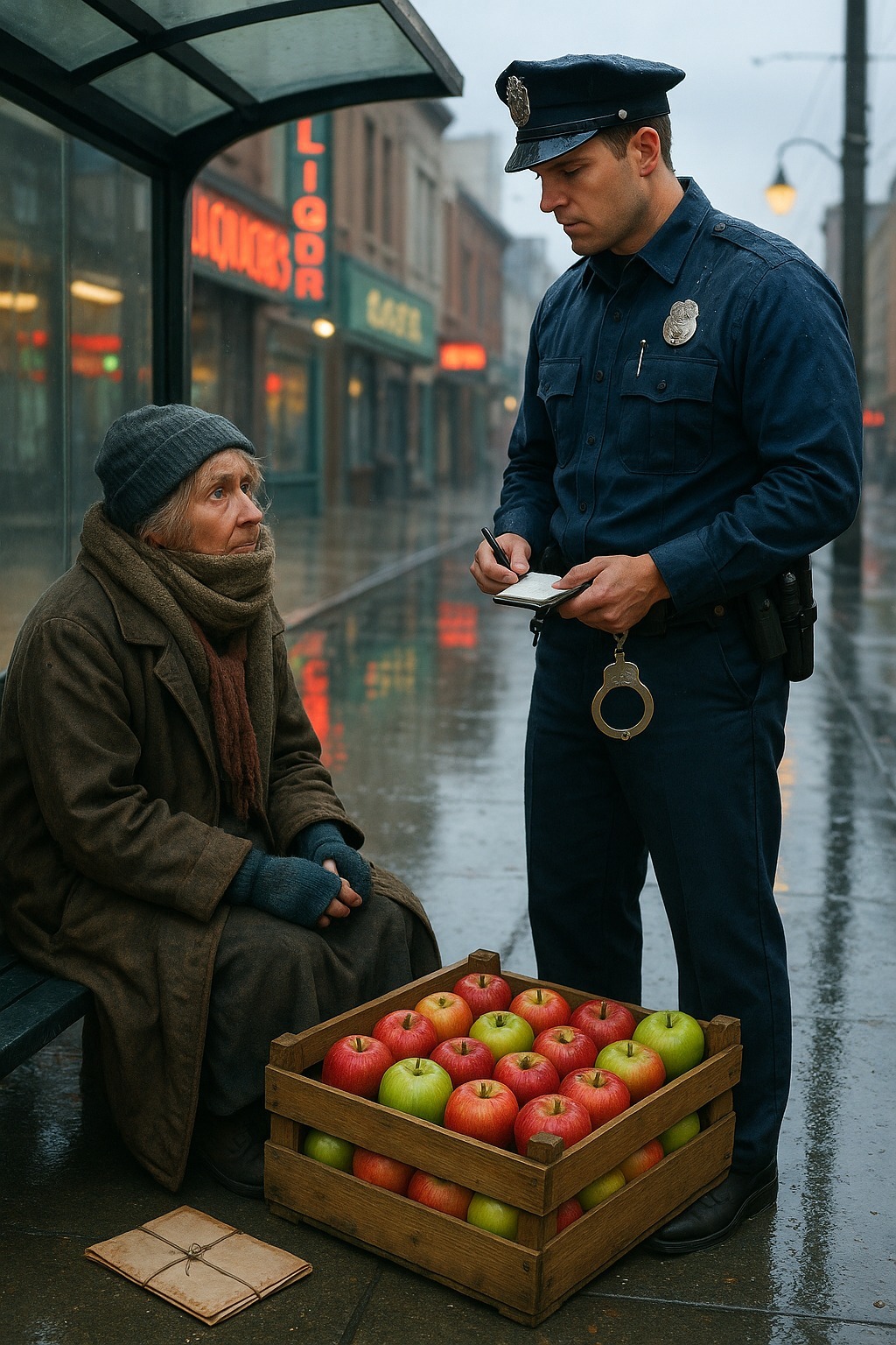 Το κρύο πρωινό ξεκίνησε με την υπηρεσία. Ψιλόβροχο, γκρίζος ουρανός, μυρωδιά βρεγμένου ασφάλτου. Στη γωνία του δρόμου, κοντά στη στάση του λεωφορείου, στεκόταν μια γυναίκα με ένα κουτί μήλα. Παλιό παλτό, χέρια τυλιγμένα με κασκόλ, πρόσωπο γεμάτο ρυτίδες και κούραση. Καθόταν σε ένα αναποδογυρισμένο κουτί και φώναζε σιγά-σιγά τους περαστικούς:
