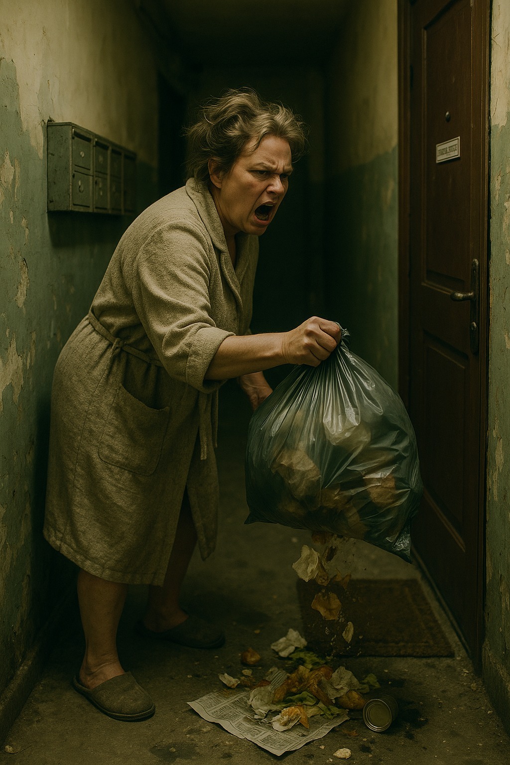 Έριχνε με θόρυβο τη σακούλα ακριβώς κάτω από το χαλάκι του. Υπολείμματα φαγητού, χαρτιά, βρωμιά. «Να ξέρει ότι τον έχουν βαρεθεί όλοι», σκεφτόταν, ικανοποιημένη με τον εαυτό της.