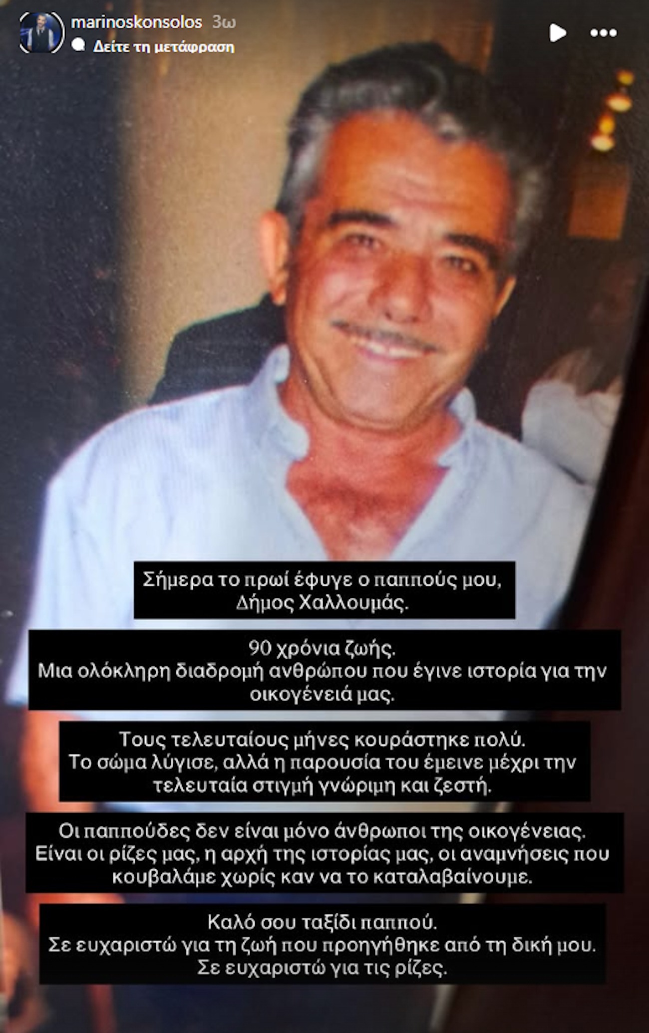 Μια απώλεια που πονά βαθιά μοιράστηκε ο Μαρίνος Κόνσολος με τους διαδικτυακούς του φίλους. Ο ηθοποιός αποκάλυψε πως ο παππούς του, Δήμος Χαλλουμάς, έφυγε από τη ζωή σε ηλικία 90 ετών, σκορπίζοντας θλίψη στην οικογένεια.