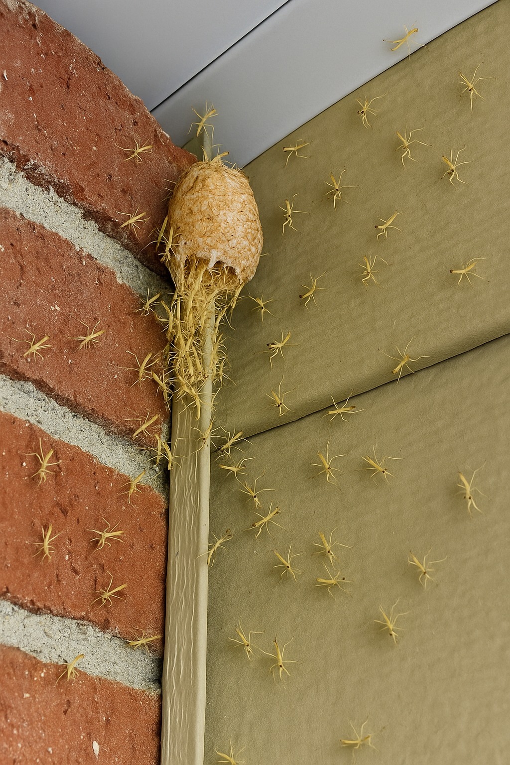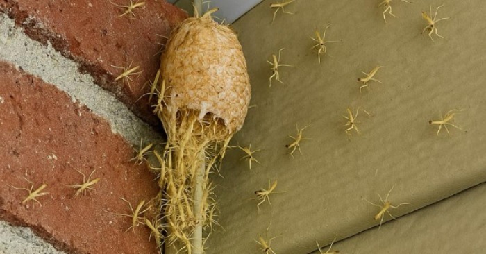 Από μια μικρή οβάλ δομή, που έμοιαζε με αφρώδη κουκούλι — ωοθήκη — ένα προς ένα έβγαιναν εύθραυστα διαφανή πλάσματα. Τα σώματά τους λάμπουν στον πρωινό ήλιο, και τα λεπτά πόδια τους, σχεδόν αβαρή, κρεμόντουσαν από τα τούβλα, τον αέρα και ακόμη και το ένα από το άλλο. Φαινόταν σαν ο ίδιος ο τοίχος να ζει και να αναπνέει. Εκατοντάδες μικροσκοπικά ακρίδες σέρνονταν αργά προς όλες τις κατευθύνσεις, σχηματίζοντας μια μικροσκοπική στρατιά νεογέννητων.