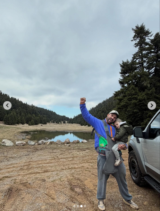 Σε άλλη ανάρτησή του, μοιράστηκε μια πιο ήρεμη αλλά εξίσου δυνατή εικόνα από βόλτα τους στη φύση. Σε αυτή, ποζάρει αγκαλιά με τον γιο του στο βουνό, συνοδεύοντας τη φωτογραφία με λόγια που φανερώνουν τη βαθιά τους σχέση: «Στον κόσμο μπορεί να είμαι πολλά… αλλά για σένα είμαι τα πάντα».