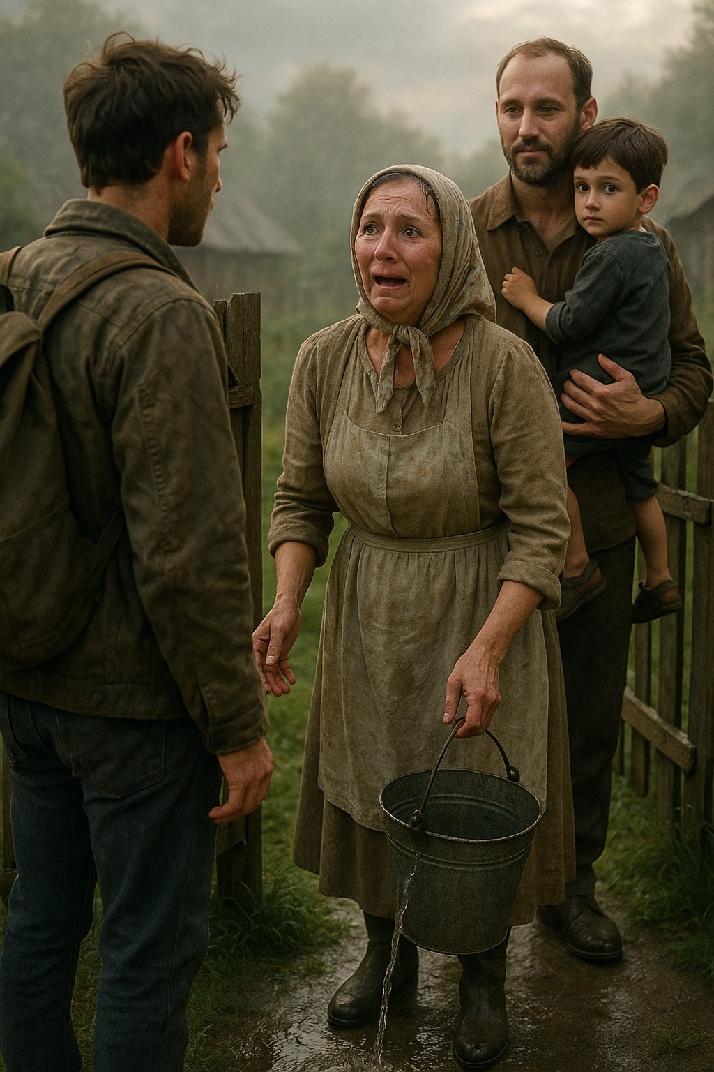 Μια γυναίκα, με μαντίλα, με ένα κουβά στα χέρια.