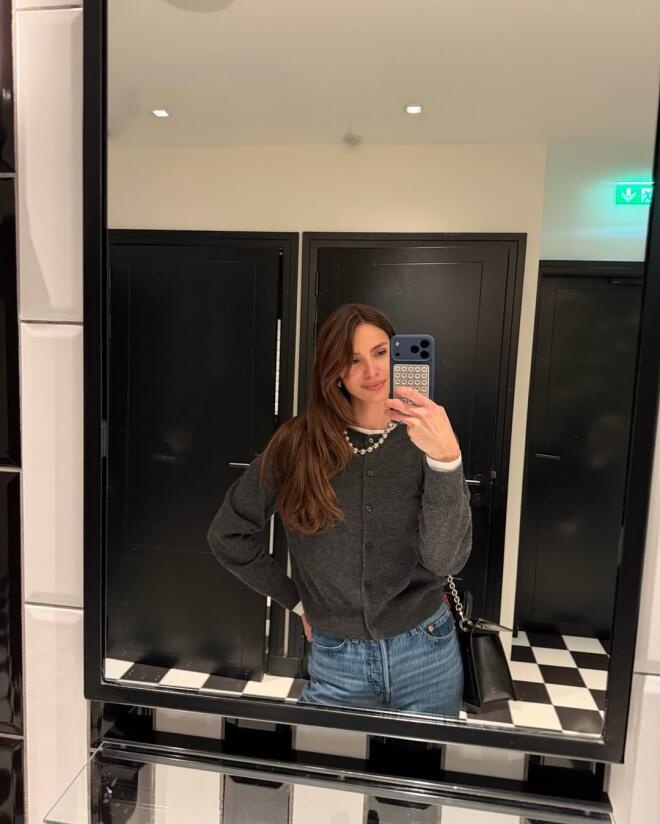 Βάση της εμφάνισής της ήταν ένα ίσιο μπλε τζιν, το οποίο συνδύασε με ένα εφαρμοστό γκρι πουλόβερ, δίνοντας μια πιο θηλυκή και ισορροπημένη γραμμή στο σύνολο.
