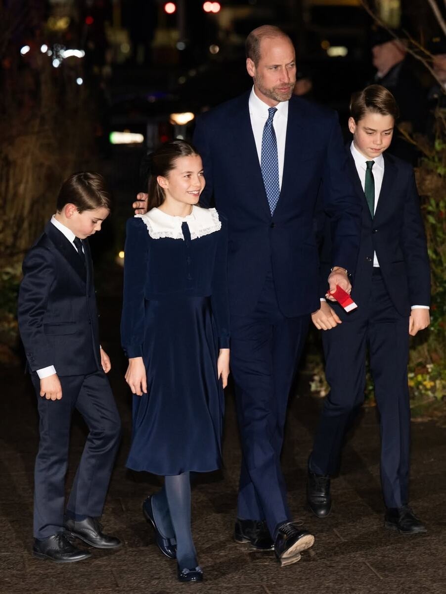 Ο πρίγκιπας Γουίλιαμ επέλεξε ένα παραδοσιακό σκούρο μπλε κοστούμι, ενώ ο Τζορτζ και ο Λούι ακολούθησαν το παράδειγμα του πατέρα τους, εμφανιζόμενοι με τα ίδια επίσημα χρώματα. Η βασιλική οικογένεια φαινόταν απίστευτα αρμονική και επίσημη.