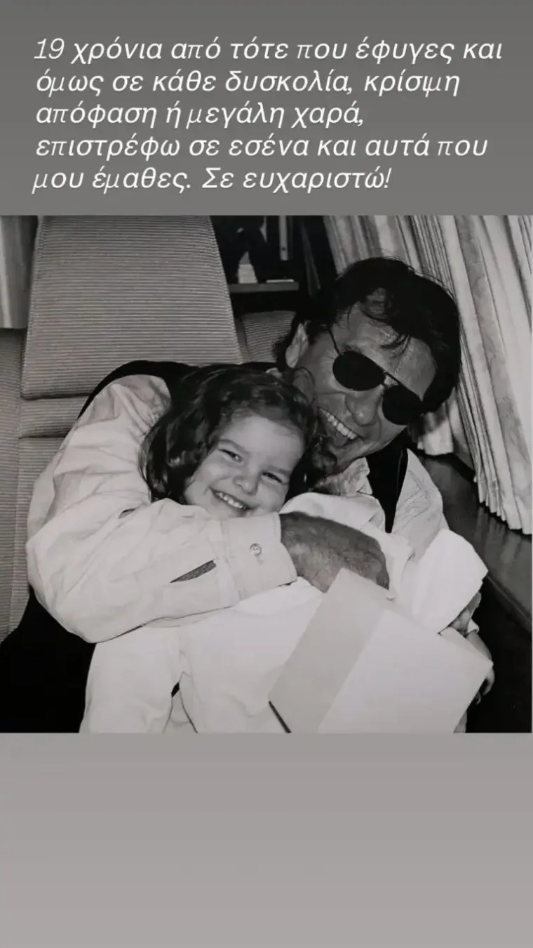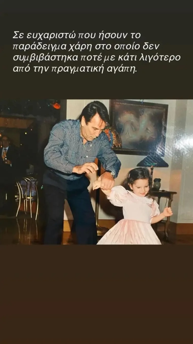 Στο συνοδευτικό της κείμενο, μίλησε για το πώς, ακόμη και σήμερα, επιστρέφει νοερά σε εκείνον σε κάθε δύσκολη στιγμή, σε κάθε κρίσιμη απόφαση, αλλά και στις μεγάλες χαρές της ζωής της. Τα λόγια της ήταν γεμάτα ευγνωμοσύνη, δείχνοντας πόσο βαθιά χαραγμένες παραμένουν οι αξίες και τα μαθήματα που πήρε από τον πατέρα της.