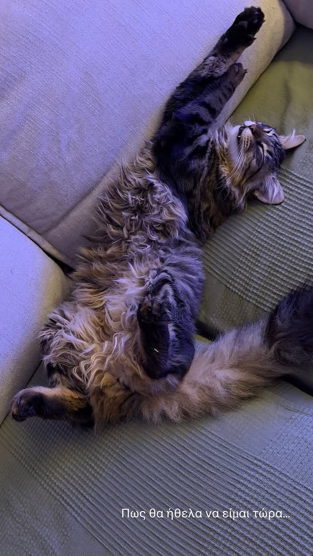 Στο πρώτο στιγμιότυπο, το γατάκι της είναι ξαπλωμένο χαλαρά στον καναπέ, απολαμβάνοντας τη νωχελικότητά του, αδιάφορο για το τι συμβαίνει γύρω του. Η Ευρυδίκη σχολίασε τη σκηνή με χιούμορ, παραδεχόμενη πως θα ήθελε κι εκείνη να βρίσκεται στη θέση του εκείνη τη στιγμή. Ένα σχόλιο που πολλές νέες μητέρες μπορούν να καταλάβουν απόλυτα, μέσα στην ένταση και την κούραση της καθημερινότητας.