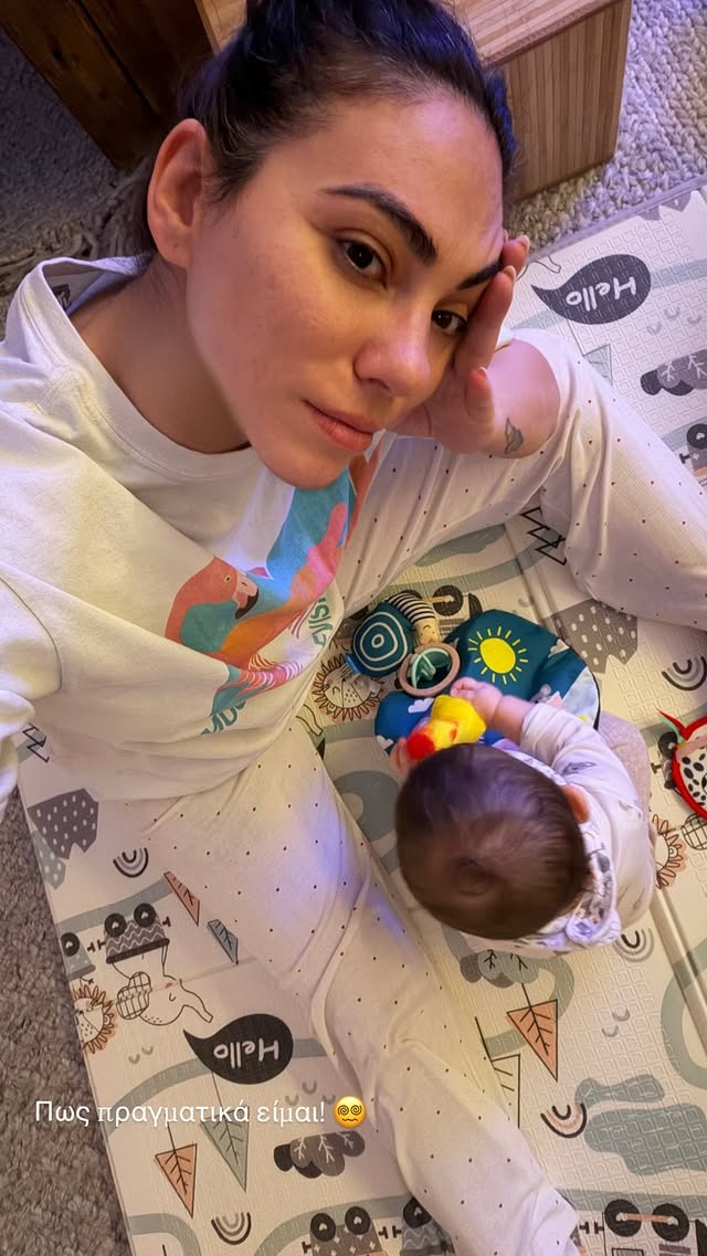 Στο επόμενο story, η εικόνα αλλάζει και γίνεται ακόμη πιο προσωπική. Η ίδια κάθεται στο πάτωμα, δίπλα στον γιο της, την ώρα που εκείνος παίζει. Χωρίς μακιγιάζ, με άνετα ρούχα και μια ήρεμη παρουσία, δείχνει πώς είναι πραγματικά η καθημερινότητά της αυτή την περίοδο. Δεν προσπαθεί να δείξει κάτι παραπάνω από αυτό που είναι: μια μητέρα απόλυτα παρούσα στη στιγμή.