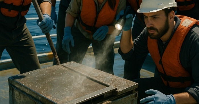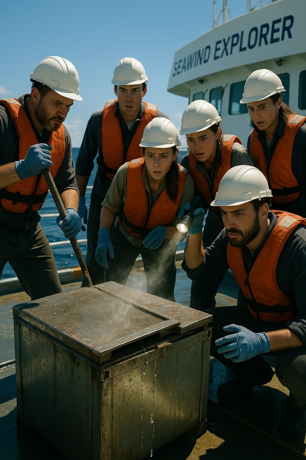 Το σχοινί τεντώθηκε, το νερό σφύριξε, και είκοσι λεπτά αργότερα, ένα τεράστιο μεταλλικό ορθογώνιο εμφανίστηκε στο κατάστρωμα. Οι ναύτες περικύκλωσαν το εύρημα. Στον ήλιο, το μέταλλο φαινόταν σχεδόν καινούργιο.