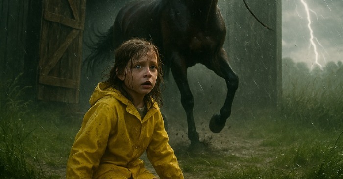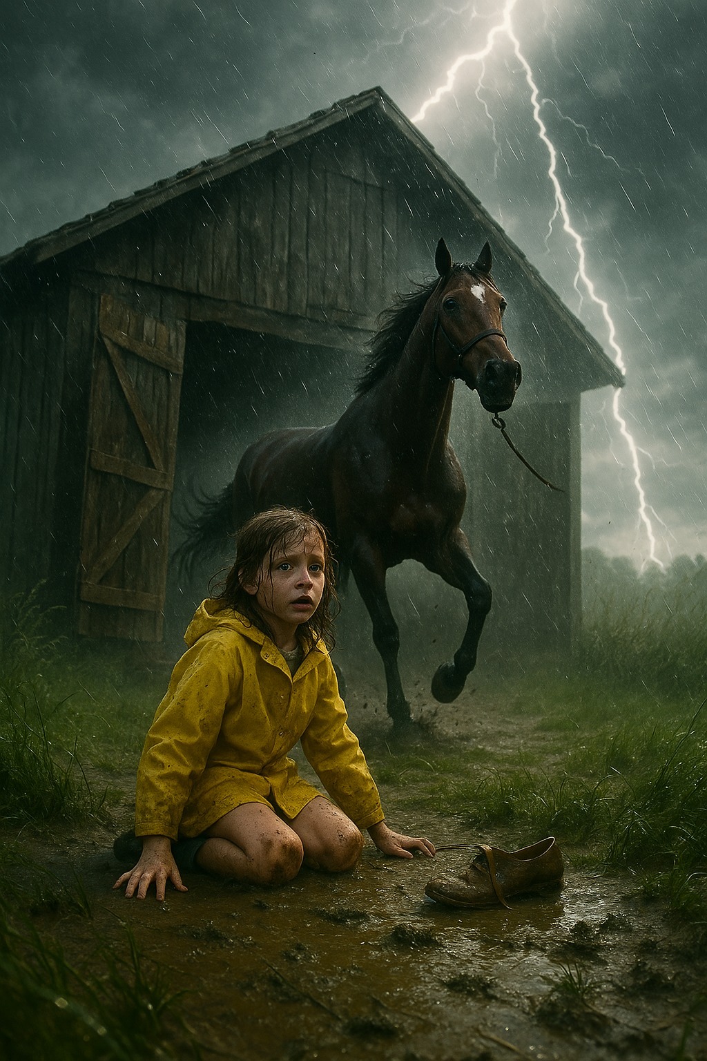Το άλογό της — εκείνο που δεν είχε αποχωριστεί τα τελευταία τρία χρόνια — στεκόταν δίπλα στην παλιά αποθήκη, τραβώντας τον δεσμό του μέσα στον πανικό. Ο βροντός έκανε τη γη να τρέμει, η βροχή χτυπούσε στο πρόσωπό της. Το κορίτσι το φώναζε με το όνομά του, προσπαθώντας να πλησιάσει, παρά τις λάμψεις που έκαναν τη γη να σείεται.