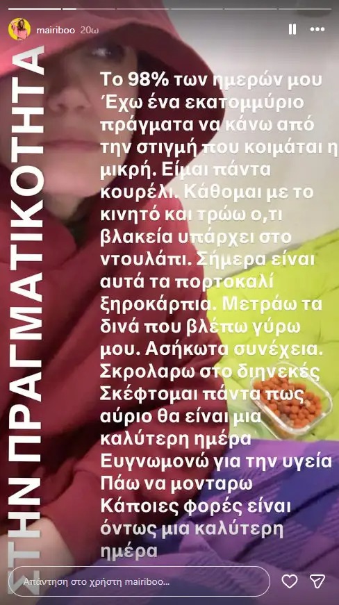 Η ίδια παραδέχεται ότι τις περισσότερες μέρες είναι εξαντλημένη. Καθισμένη με το κινητό στο χέρι, τρώει ό,τι βρει πρόχειρο στο ντουλάπι, όχι από επιλογή αλλά από καθαρή εξάντληση. Δεν το κρύβει, δεν το ντύνει με όμορφες λέξεις. Είναι αυτό που είναι.