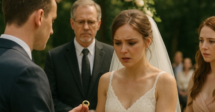 Όταν ο γαμπρός άπλωσε το χέρι του για να φορέσει το δαχτυλίδι στη νύφη, η Έμμα πάγωσε.