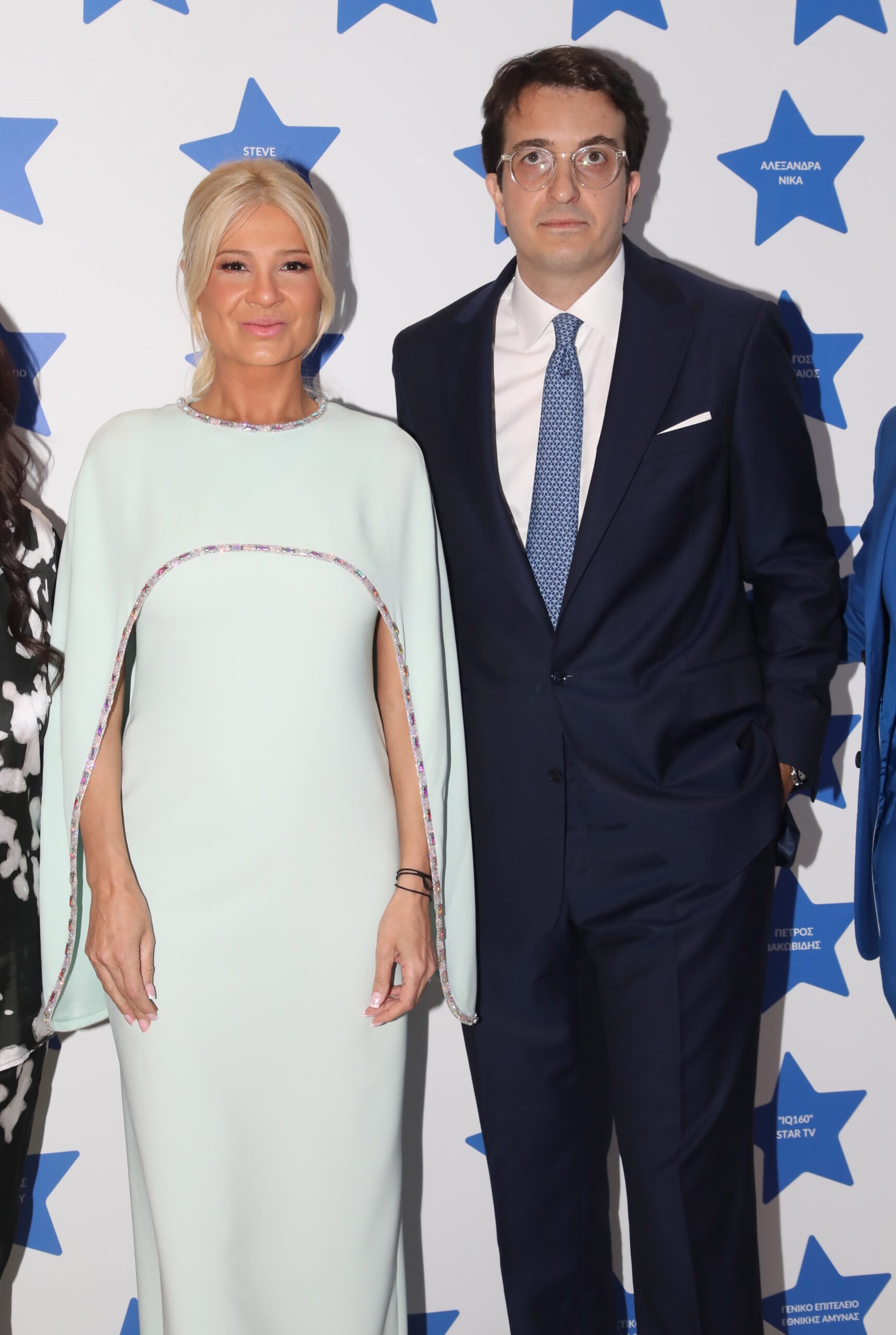 Δίπλα της, ο σύντροφός της εμφανίστηκε με σκούρο μπλε κοστούμι, κρατώντας χαμηλούς τόνους αλλά συμπληρώνοντας αρμονικά την παρουσία της.