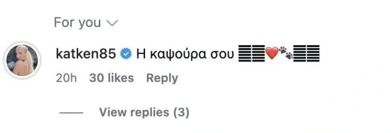 Μεταξύ των σχολίων ξεχώρισε εκείνο της Κατερίνας, η οποία με λίγα λόγια εξέφρασε την αγάπη της για τον σύντροφό της: «Η καψούρα σου», συνοδευόμενο από καρδιές και μικρά πατουσάκια. Το σχόλιο απέδειξε με παιχνιδιάρικο τρόπο την οικειότητα και την τρυφερή σχέση τους.