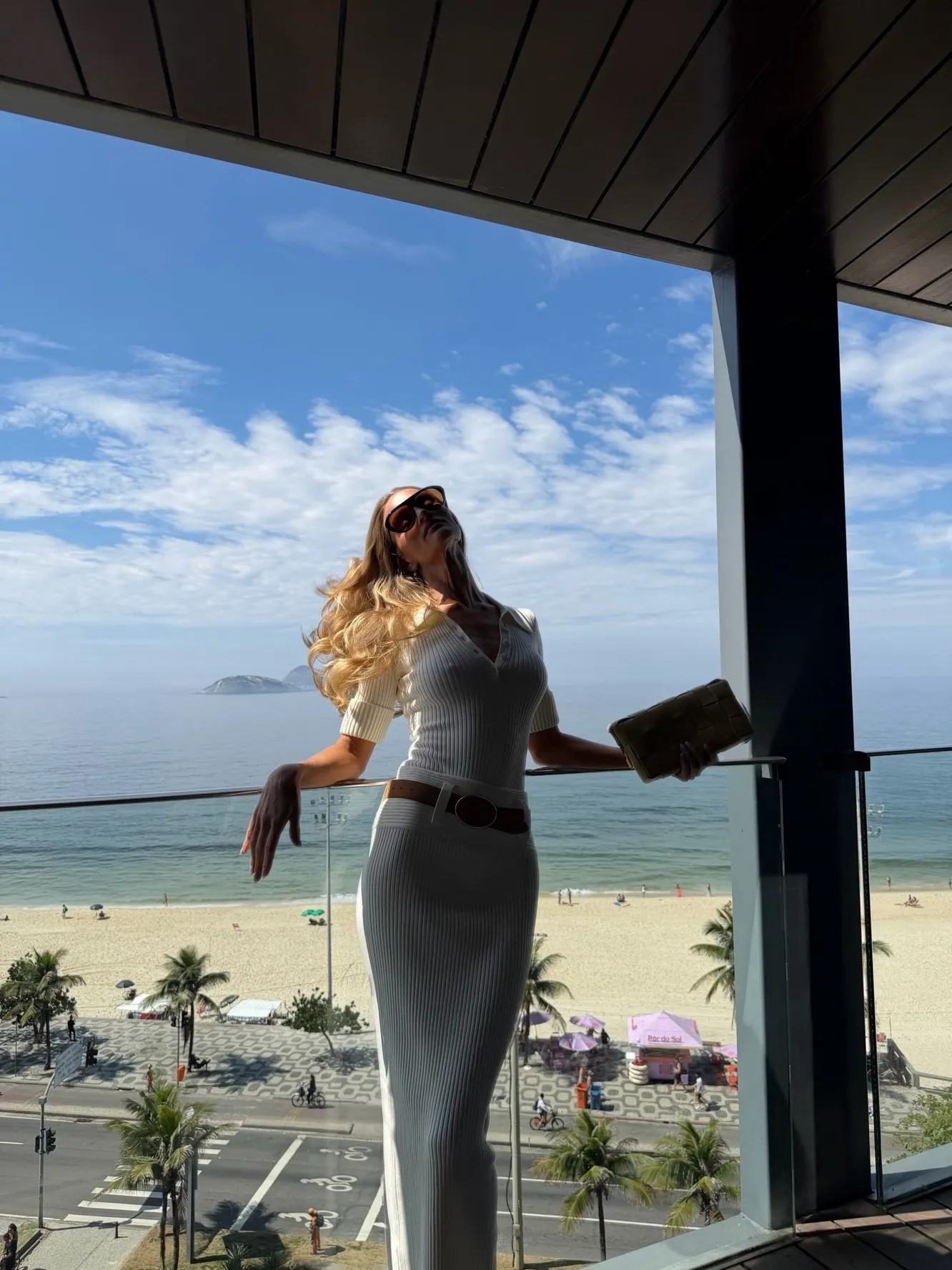Σε μια άλλη φωτογραφία, η «άγγελος» της Βικτόριας Σίρκετ πόζαρε σε μια ηλιόλουστη βεράντα, ανάμεσα σε τροπικά φυτά και με πανοραμική θέα στο Ρίο. Η Ρόζι δοκίμασε ένα μαγιό σε απαλό κρεμ χρώμα με σκίσιμο στην κοιλιά και αργότερα ένα μακρύ λευκό φόρεμα με βαθύ ντεκολτέ και καφέ ζώνη στη μέση. Τα looks συμπληρώθηκαν με γυαλιά ηλίου και ένα κομψό clutch — η μοντέλο έμοιαζε με ηρωίδα μιας πολυτελούς λατινοαμερικανικής διαφήμισης.