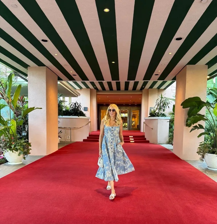 Στις φωτογραφίες, η ίδια κινείται ανάμεσα σε καταπράσινους κήπους και χαρακτηριστικά σημεία του ξενοδοχείου, απολαμβάνοντας την ατμόσφαιρα που θυμίζει κινηματογραφικό σκηνικό. Κάθε εικόνα δείχνει την προσεγμένη πλευρά της διαμονής της, με την πολυτέλεια να κυριαρχεί.