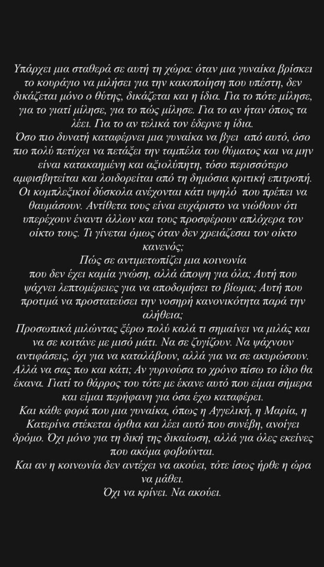 Η ανάρτησή της στο Instagram δεν περιορίστηκε σε μια απλή δήλωση στήριξης, αλλά άγγιξε ένα ευρύτερο ζήτημα, αυτό της στάσης της κοινωνίας απέναντι στις γυναίκες που αποφασίζουν να μιλήσουν.