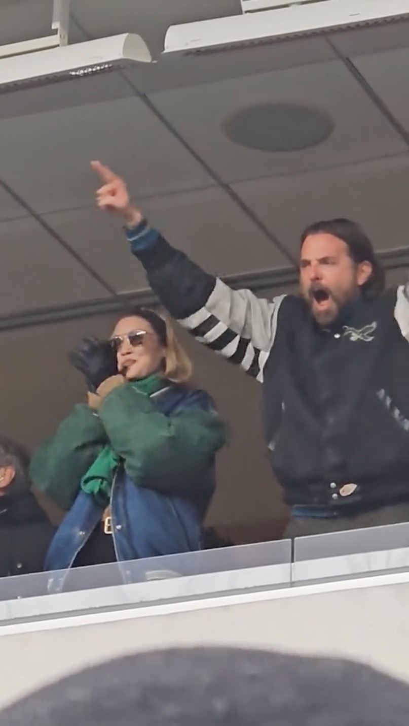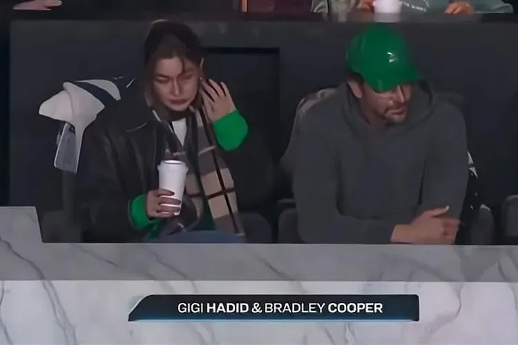 Το ζευγάρι εμφανίστηκε στο γιγαντοοθόνη, καθισμένο σε ένα από τα θεωρεία του σταδίου και φορώντας σχεδόν πανομοιότυπα ρούχα. Ο Κούπερ, παλιός οπαδός των Ιγκλς και ντόπιος της Πενσυλβανίας, εμφανίστηκε με σκούρο γκρι φούτερ, πράσινο καπέλο του συλλόγου και λεπτά γυαλιά με μεταλλικό σκελετό. Η Χαντίντ υποστήριξε τον αγαπημένο της: συνδύασε ένα πράσινο φούτερ των Ιγκλς με μια μαύρη δερμάτινη oversize ζακέτα, σκούρα τζιν και καφέ καρό κασκόλ. Η μοντέλο έδεσε τα κοντά μαλλιά της σε έναν ατημέλητο κότσο, αφήνοντας μερικές τούφες κοντά στο πρόσωπό της, ενώ το μακιγιάζ της ήταν απαλό και λαμπερό — ροζ αποχρώσεις, εκφραστικά φρύδια και γυαλιστερά χείλη.