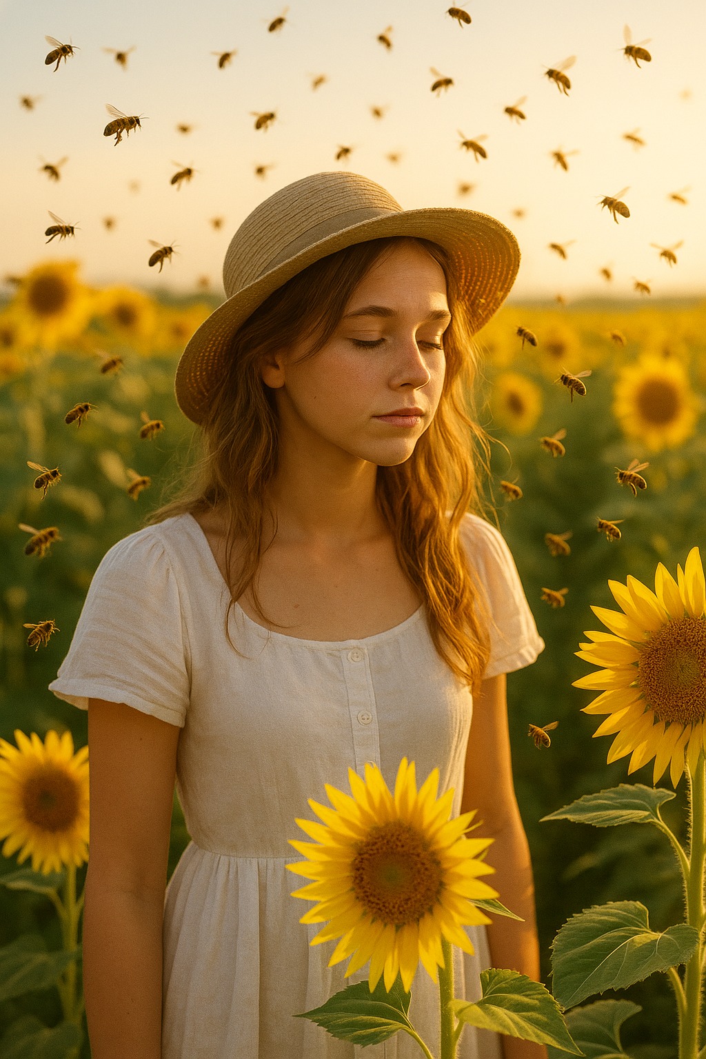 Στεκόταν ανάμεσα σε ηλίανθους — βουιστούς, ζωντανούς, τεράστιους — και ξαφνικά ένιωσε… γαλήνη.