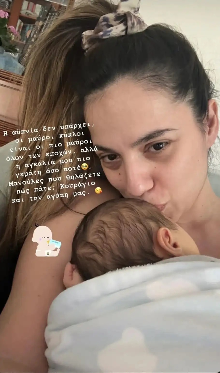 Στη λεζάντα, επέλεξε να είναι απόλυτα ειλικρινής: «Η αϋπνία δεν υπάρχει, οι μαύροι κύκλοι είναι οι πιο μαύροι όλων των εποχών, αλλά η αγκαλιά μου πιο γεμάτη από ποτέ… Μανούλες που θηλάζετε, πώς πάτε; Κουράγιο και την αγάπη μας».