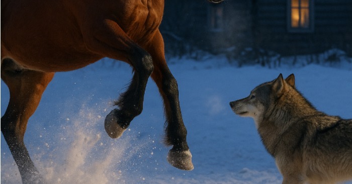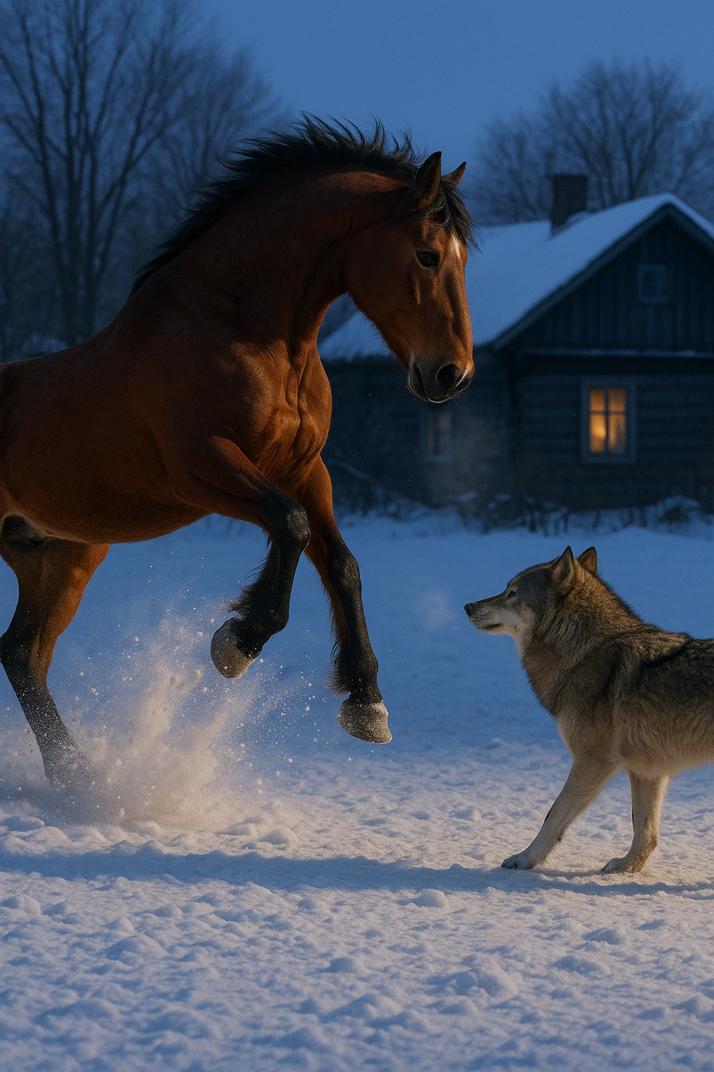 Όταν ο λύκος πάτησε στην αυλή, το χιόνι έτριξε κάτω από τα πόδια του — αθόρυβα, μα αρκετά.