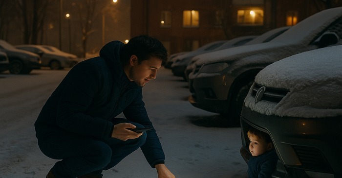 Ο ήχος επαναλήφθηκε — ένα σύντομο, σιγανό κλάμα, που ακουγόταν από κάτω από το παρκαρισμένο SUV. Η καρδιά του χτύπησε δυνατά. Ο Μάξιμος έσκυψε, γονάτισε, κοίταξε κάτω από το αυτοκίνητο και πάγωσε.