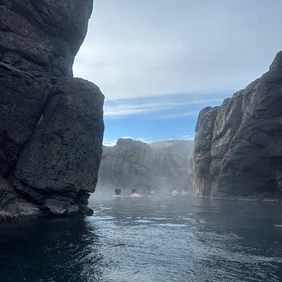 Εκεί, εμφανίζεται να απολαμβάνει το ζεστό νερό μέσα στο παγωμένο τοπίο, δημιουργώντας μια έντονη αντίθεση που εντυπωσιάζει.