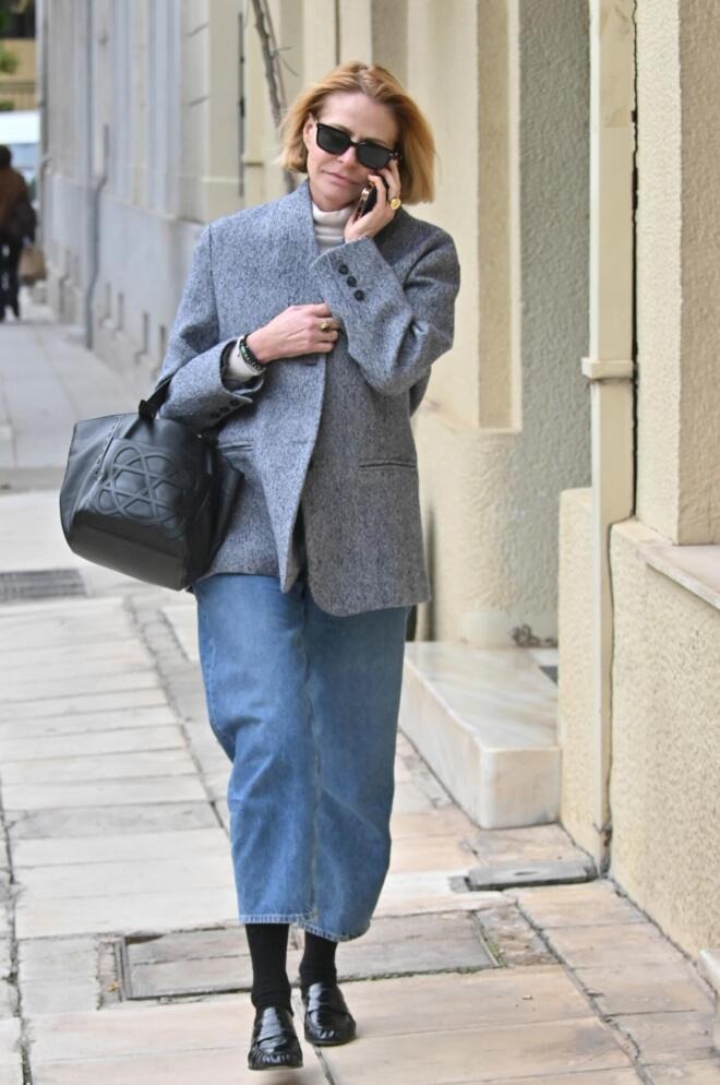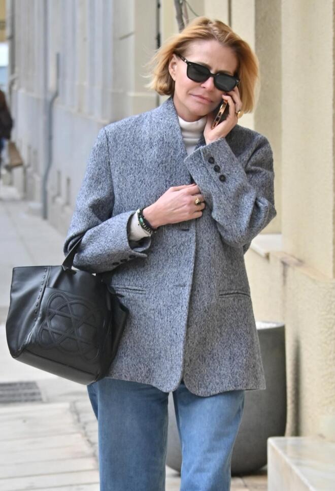 Φορώντας ένα κρεμ ζιβάγκο, τζιν παντελόνι και γκρι μάλλινο σακάκι σε άνετη γραμμή, δημιούργησε ένα look ιδανικό για τη μεταβατική περίοδο από τον χειμώνα στην άνοιξη. Το σύνολο ολοκληρώθηκε με μαύρα δερμάτινα loafers και μια μαύρη tote bag, που προσέθεταν τόσο κομψότητα όσο και πρακτικότητα. Η άνεση και η λειτουργικότητα συνδυάστηκαν με σύγχρονη αισθητική, κάνοντας το outfit κατάλληλο για καθημερινές βόλτες στην πόλη.