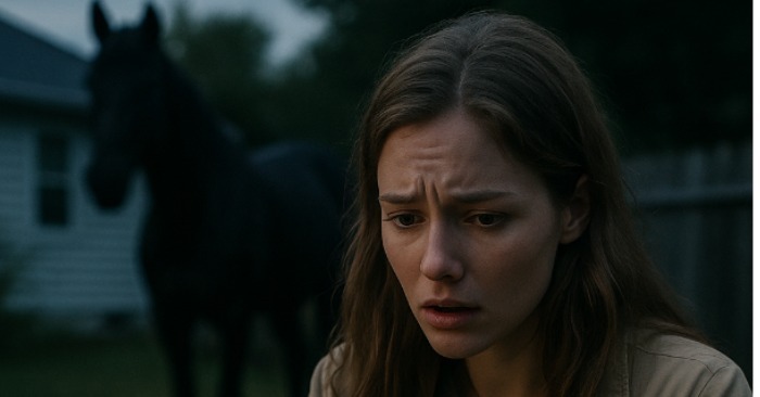 Στη μικρή αυλή του προαστιακού σπιτιού της — περιφραγμένη από όλες τις πλευρές — στεκόταν ένα τεράστιο, κατάμαυρο άλογο. Τα μάτια του λάμπουν στον πρωινό ήλιο, η αναπνοή του θολώνει τον αέρα. Χτυπούσε το χορτάρι με τα πόδια του σαν να ήταν δικό του.