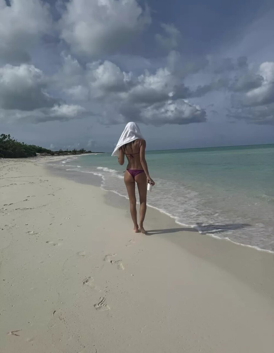 Αργότερα, η φωτογράφιση συνεχίστηκε σε μια απομονωμένη παραλία. Η Ιρίνα εμφανίστηκε στο κάδρο με μια λευκή πετσέτα στο κεφάλι — ένα λακωνικό στοιχείο που έρχονταν σε ευνοϊκό αντίθεση με το χρυσαφένιο μαύρισμά της. Σε συνδυασμό με τον ωκεανό και την έρημη ακτή, οι φωτογραφίες έγιναν σχεδόν κινηματογραφικές.