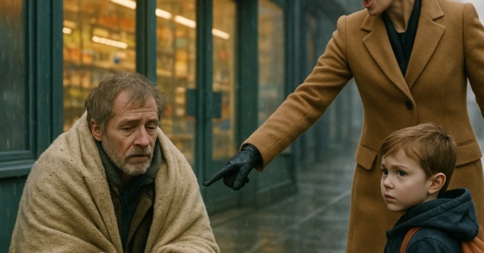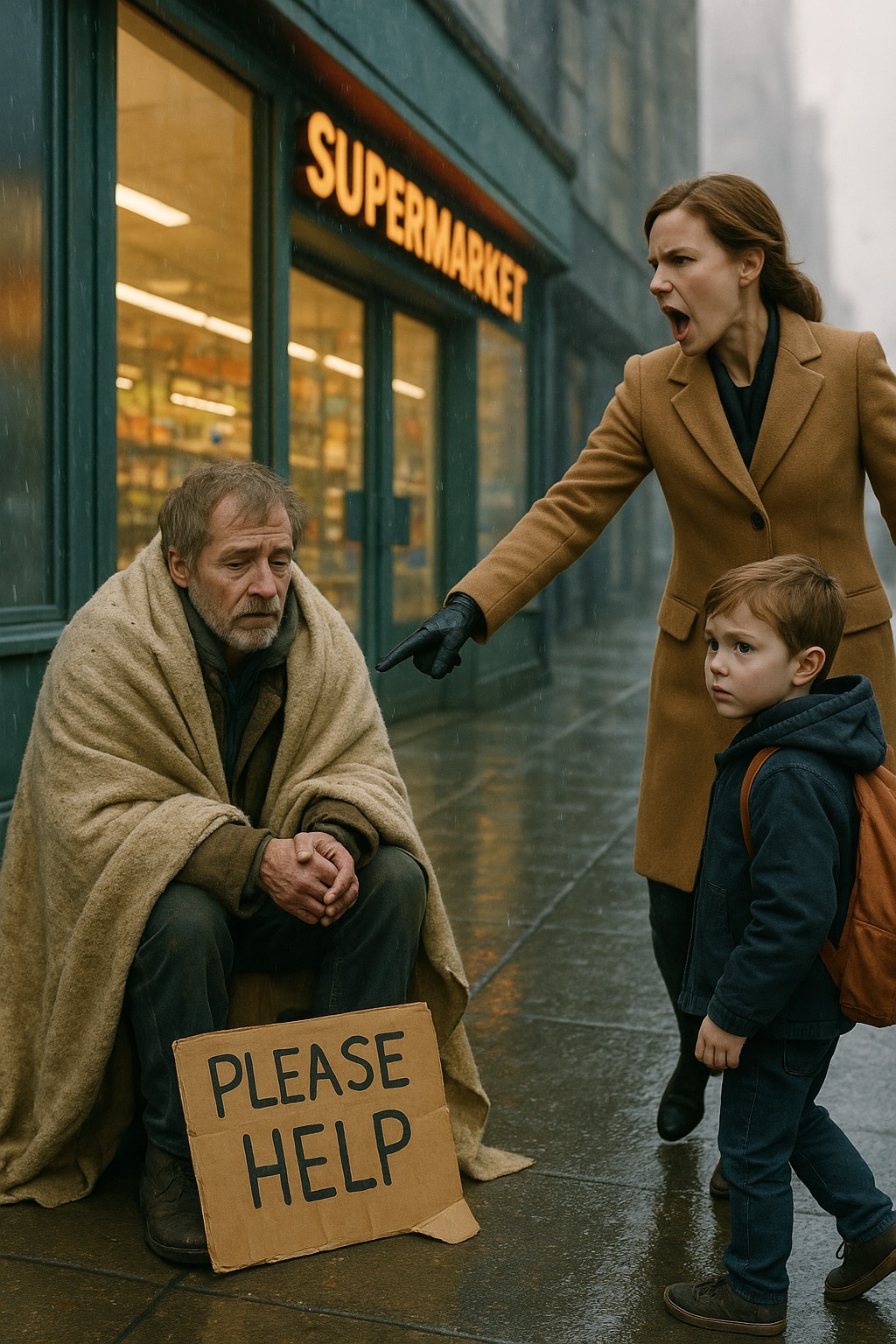 Κρύο πρωινό. Η πόλη ζούσε με τον βιαστικό της ρυθμό — αυτοκίνητα, θόρυβος, άνθρωποι με καφέ στα χέρια. Ένας άντρας καθόταν έξω από το σούπερ μάρκετ με μια κουβέρτα στους ώμους και ένα χαρτόνι που έγραφε: «Βοηθήστε, όποιος μπορεί». Το πρόσωπό του ήταν αξύριστο, τα μάτια του κουρασμένα, αλλά όχι κενά.