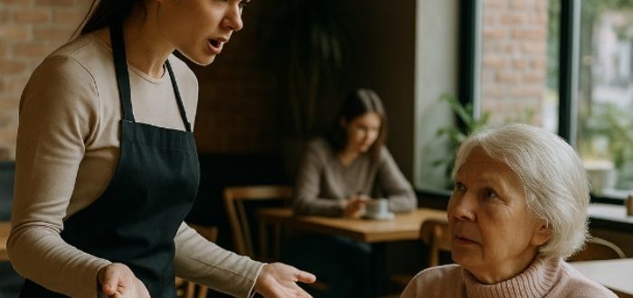 Το καφέ ήταν σχεδόν άδειο. Φθινοπωρινό πρωινό, η μυρωδιά του φρέσκου καφέ και του βρεγμένου δρόμου απ’ έξω. Πίσω από τον πάγκο στεκόταν η σερβιτόρα — νέα, με