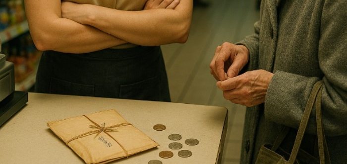 Το μαγαζί ήταν σχεδόν άδειο. Βράδυ, αμυδρό φως από τις λάμπες, μυρωδιά φθηνού ψωμιού και βρεγμένων μπουφάν. Στο ταμείο — μια νεαρή πωλήτρια, κουρασμένη, εκνευρισμένη, έτοιμη να κλείσει.