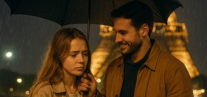 Το Παρίσι σκεπάστηκε από μια ξαφνική βροχή.Ζεστή, καλοκαιρινή — απ’ αυτές που δεν κρύβεσαι, απλώς γελάς και τρέχεις όπου σε βγάλει ο δρόμος. Η Έμμα περπατούσε στην προκυμαία