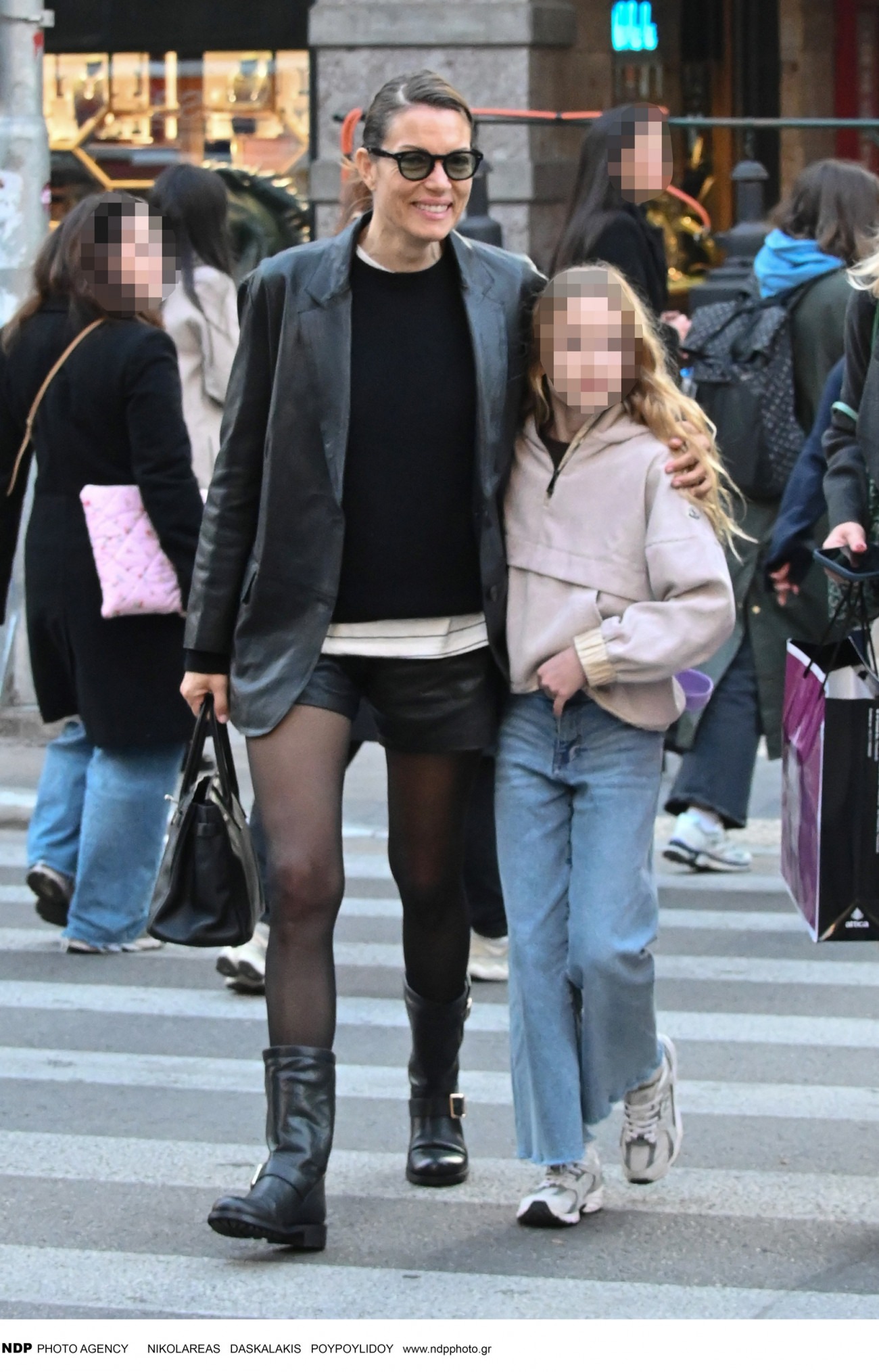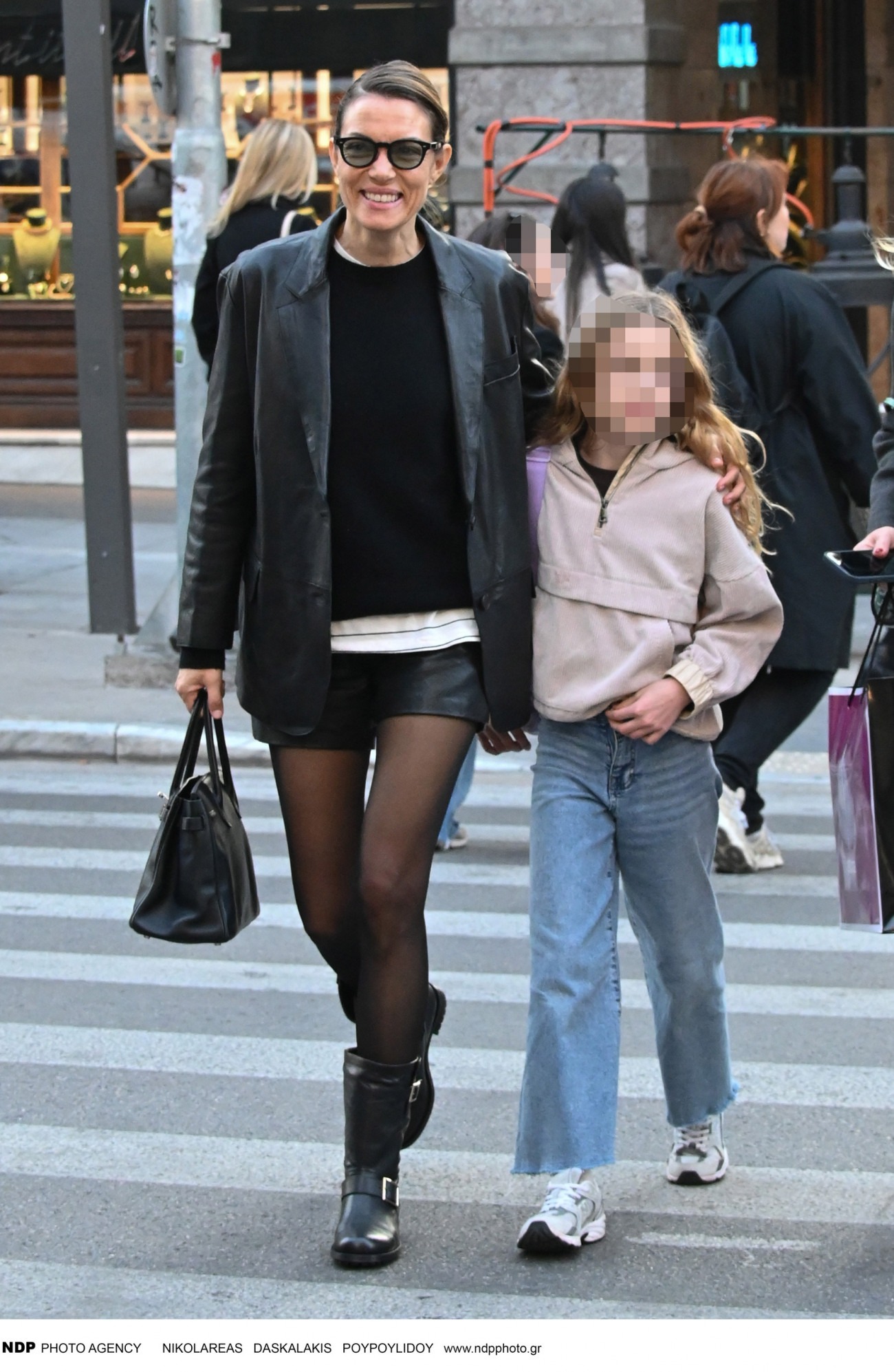 Το σύνολο ολοκληρώθηκε με leather shorts, μαύρο καλσόν και μαύρες flat μπότες μέχρι τη μέση της γάμπας, δημιουργώντας ένα αποτέλεσμα δυναμικό αλλά ξεκάθαρα θηλυκό. Η κλασική μαύρη τσάντα σε πρακτικό μέγεθος και τα γυαλιά ηλίου, σταθερή αξία σε κάθε της εμφάνιση, έδεσαν το look με τον πιο φυσικό τρόπο.